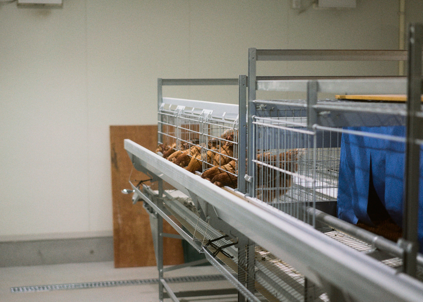 写真上はケージフリー(平飼い)で育てられている鶏たち。写真下はケージフリーで"マンション"のような棚構造で鶏が上下運動できる「多段式エイビアリー」スペースの様子。他に、金属製のケージに複数羽の鶏を収容する「バタリーケージ飼育」。バタリーケージをベースに、鶏が自然な行動を取れるよう止まり木や巣箱・砂浴び場などを設置した「エンリッチドケージ飼育」があります。