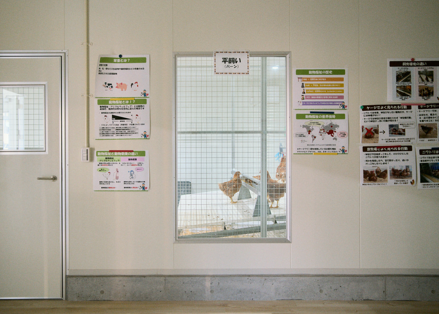 鶏は室内と半屋外スペースを自由に行き来することができ、建物中央部には研修や講義、打ち合わせが可能な多目的スペース、その奥には左右のガラス越しに飼育風景が見られる見学スペースが用意されています。