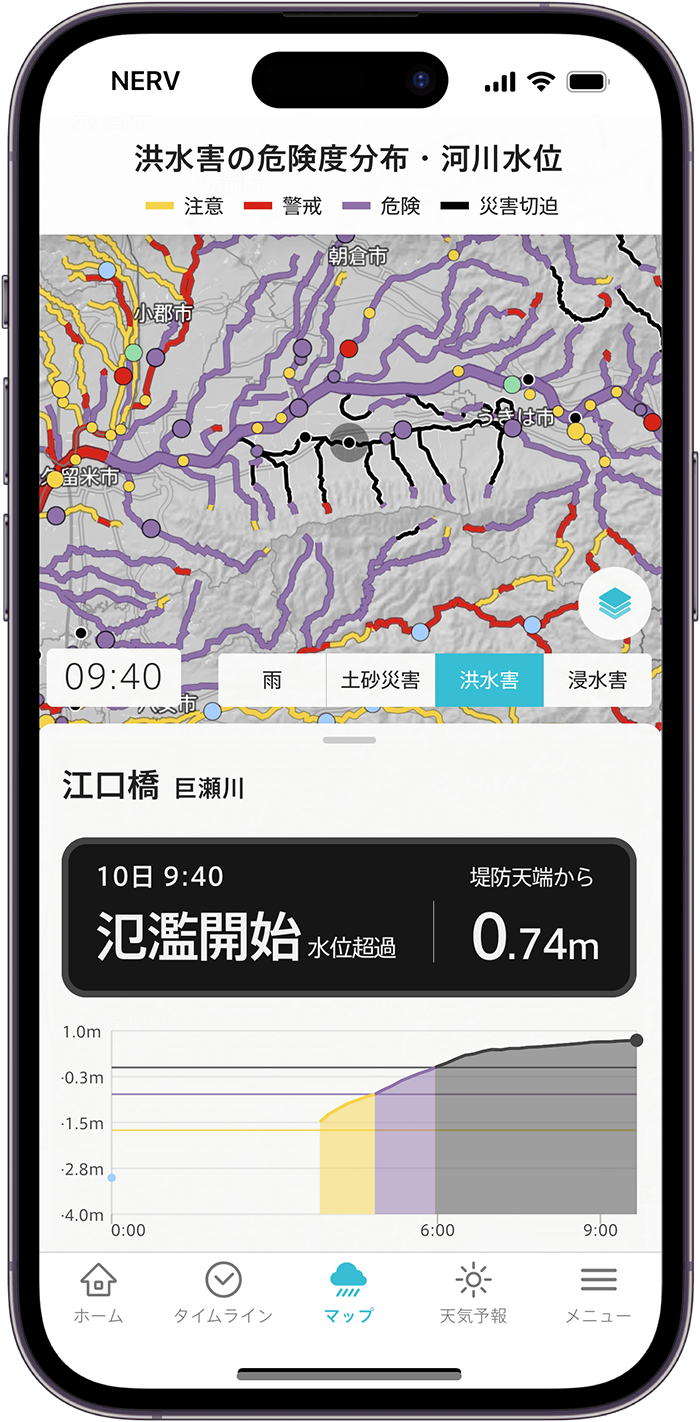 NERVアプリの画面。地震だけではなく津波、台風、洪水、土砂災害警戒情報など、さまざまな種類の災害情報を扱っています。