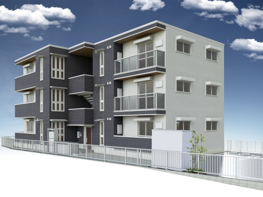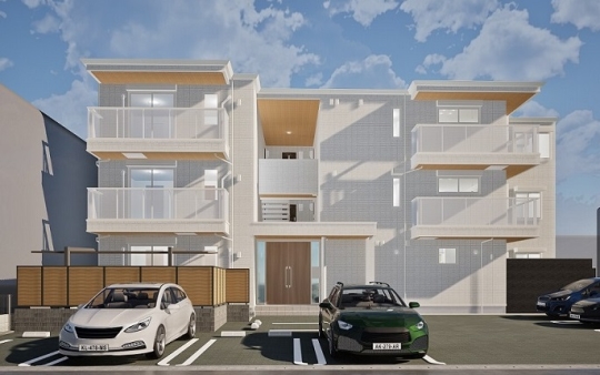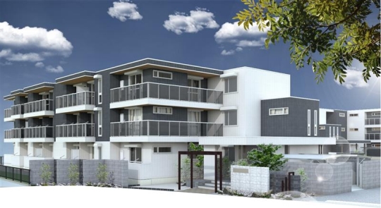 Nearly ZEH-M仕様のTORISIAの会場です。建物全体を高断熱化することで、ご入居者には年間を通じて寒暖差が少ない快適な暮らしを提供するとともに、省エネルギー設備機器などの導入により、光熱費を削減。災害などによる停電時においても、日射がある時間帯は太陽光発電パネルで発電した電力を使用いただけます。また、約960坪の敷地に2棟(単身向け・ファミリー向け)を配置し、雁行させた外観も魅力です。