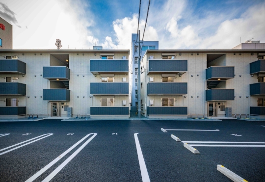ZEH-M Oriented仕様、重層タイプの賃貸住宅です。全戸が1階に玄関を持つので独立性が高まり、プライバシーに配慮できます。また、共用部分がないことから、メンテナンス費用の軽減も期待できます。
