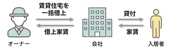 オーナーは不動産管理法人を設立し、所有する賃貸住宅を会社に一括で貸し付けます。そして会社はオーナーに借上げ賃料を支払い、借り上げた賃貸住宅についてご入居者を募集し「家賃収入」を得ます。ご入居者からの家賃のやり取りや管理はすべて会社が行い、オーナーに定額の賃料を支払います。