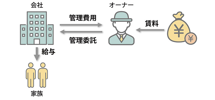 管理委託方式は、オーナーが会社に対し、不動産から得られる賃料等の収入の一部を「管理費」として支払う方法です。そして、会社に入った「管理費」の中から、オーナーのご家族に給与を支払うというイメージです。