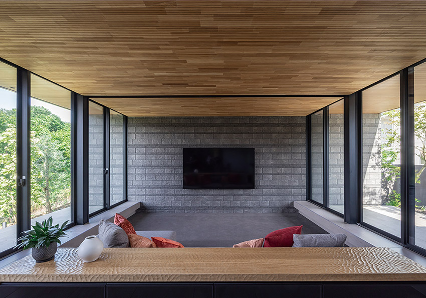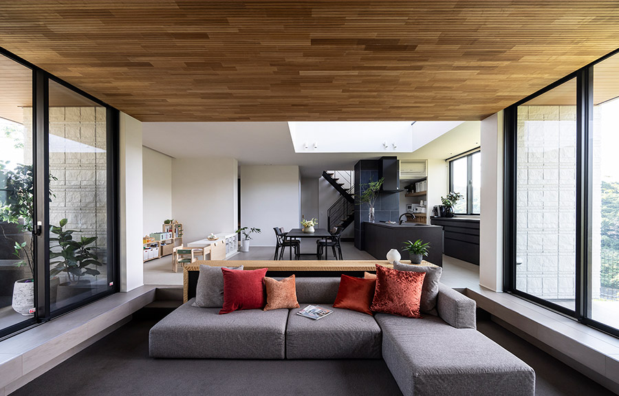 ロースタイルリビングには開口部をシンメトリーに配しました。室内から屋外の袖壁まで連続させたアクセントタイルや、天井面と軒天の意匠をつなげた設計によって、内と外をシームレスに一体化。実際の面積以上の広がりを感じる空間が生まれています。