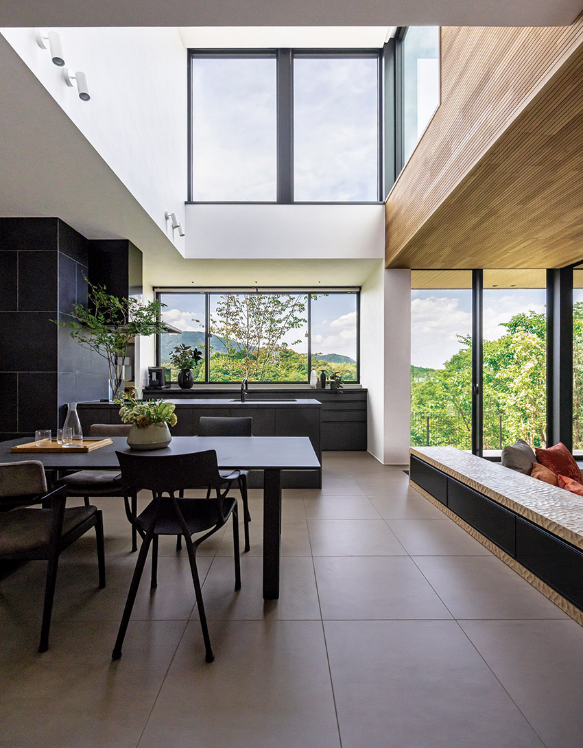 新緑、紅葉、雪景色と、一年を通して変わる景色が住まいの主役。インテリアはシンプルに整え、窓越しの自然を際立たせています