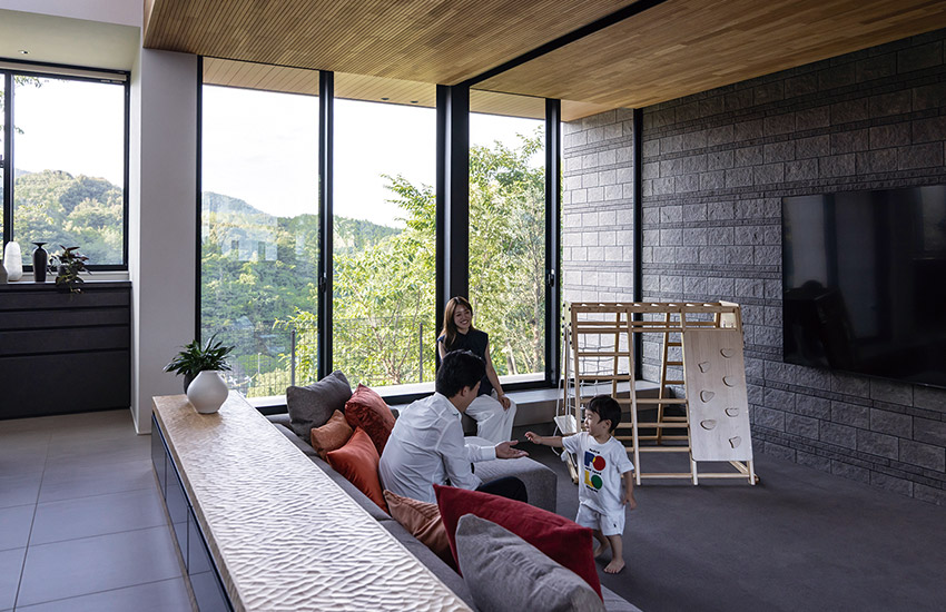 カーペット敷きのリビングにごろんと寝転び、外の景色を眺めるのがご家族のお気に入りの過ごし方。長男の天凰(てんま)くん(2歳)は、木の枝に止まる鳥を見つけるたび、楽しげに声をあげるそう。窓越しに広がる自然が暮らしの一部となり、家族の毎日に喜びを運んでいます。