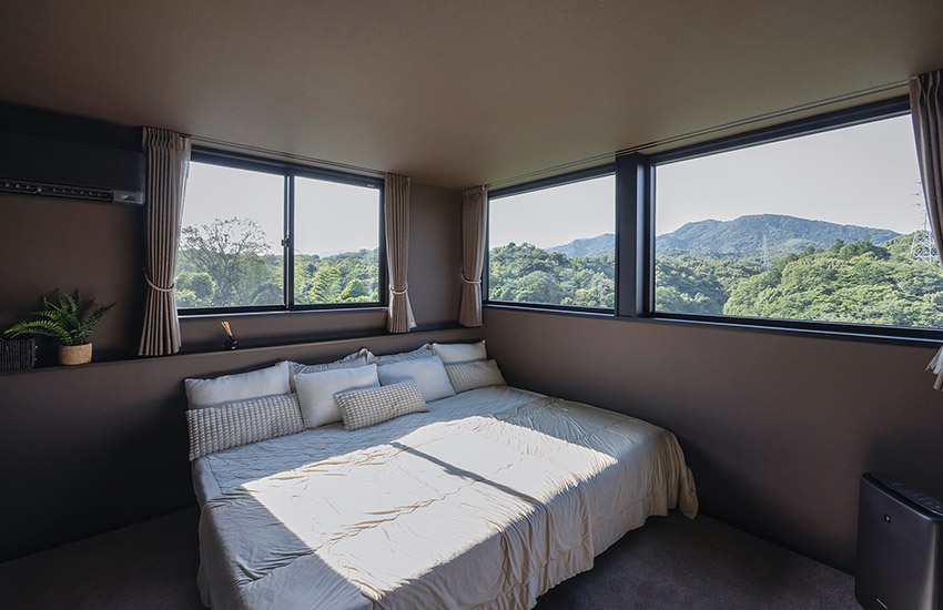 主寝室はダークカラーでコーディネートし、落ち着いたリラックス空間を演出。1階よりもさらに開けた眺望が、絵画のように空間を彩ります
