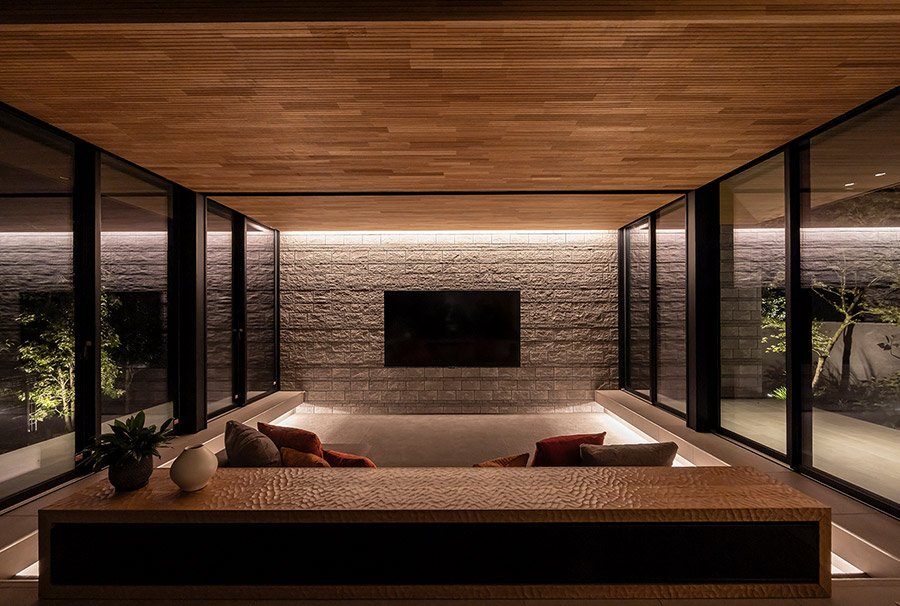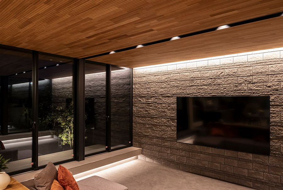 夜の帳が下りると、リビングを挟む2つの大窓は黒い鏡面へと姿を変えます。コーニス照明の光がガラス面に映り込み、途切れのない光のラインとなって空間に無限の奥行きを与えます。化粧天井には1本のスリットを設け、ダウンライトを埋め込みました。スリットと窓枠が描くコの字型のフレームは外観デザインと呼応し、住まい全体に統一感ある美しさをもたらしています。