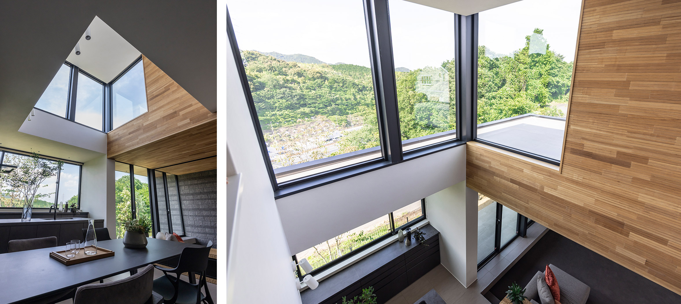 窓の向こうに見える山並みや木立、ぽっかりと切り取られた空。LDKに一歩足を踏み入れると、住宅街にいることを忘れてしまうほどの眺望が目に飛び込んできます。「窓をたくさん設けて、風が通り抜ける家にしたい」というSさまの願いをかなえた、自然と隣り合わせの住まいです。