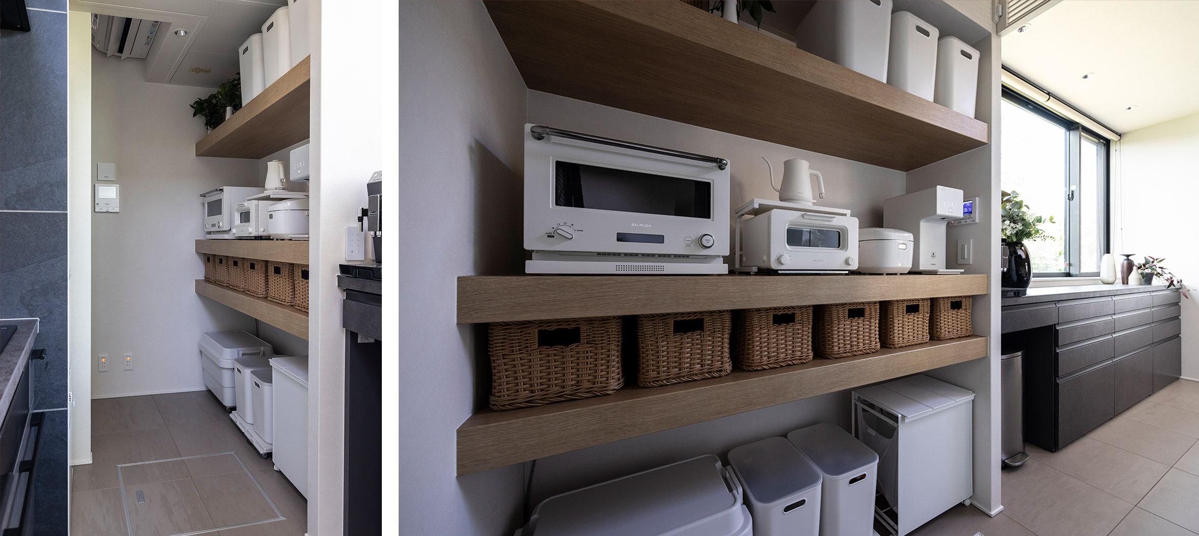 「できる限り生活感をなくしたい」という理紗さんの美意識は、パントリースペースにも表れています。白で統一された家電や収納ケースが整然と並び、目に触れない場所にまで行き届いたこだわりが感じられます。