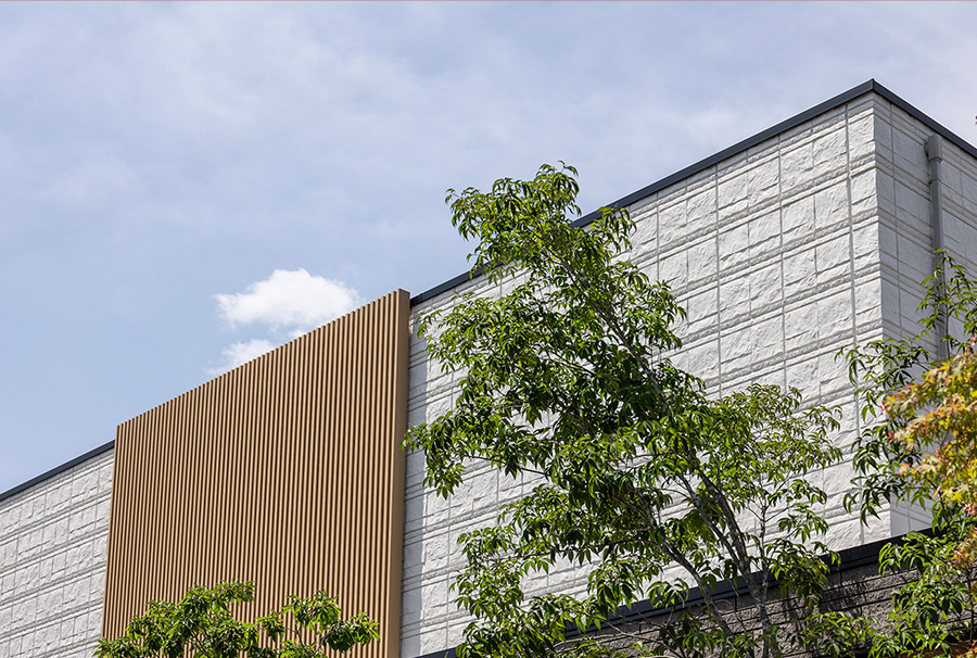 白いキャンバスのような外壁に、シンボルツリーが彩りを添えるファサード。格子状の意匠が、シンプルな構成の中に豊かな表情を加えています。