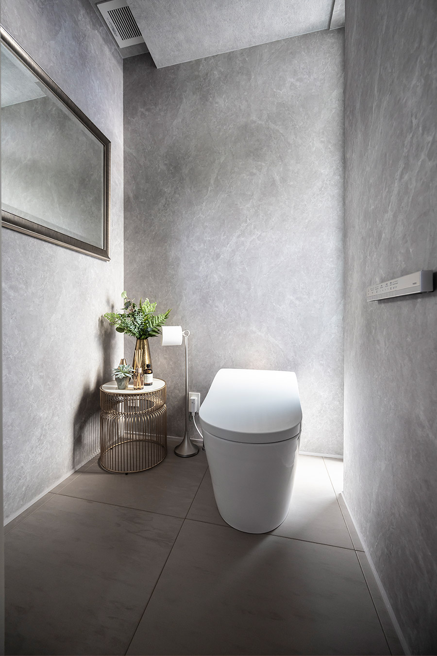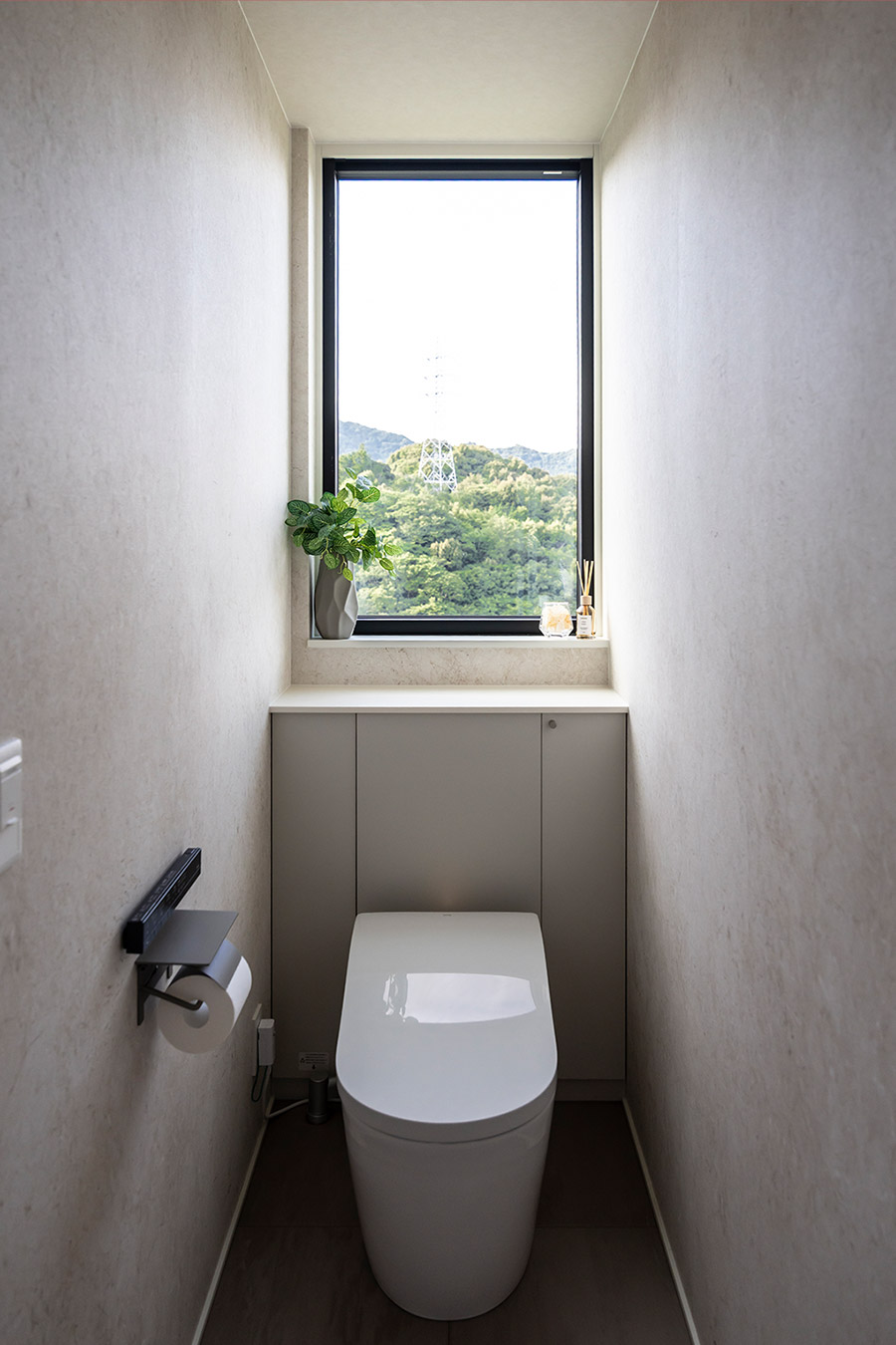 1階のトイレはスリット窓から入る光が陰影を描き、落ち着いた印象。2階は大胆に窓を設けて開放感を演出。どちらもグレージュでコーディネートされた、心地良い空間です。
