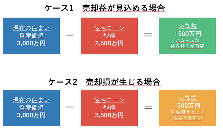 現在の住まいを売却した際の手取り額が残債を上回る「売却益が見込める状態」であれば、スムーズな住み替えが可能です。売却益は新居の頭金として活用でき、新たなローンの負担も軽減されます。一方、売却価格が残債を下回る「売却損が生じる状態」の場合でも、適切な計画と資金調達により住み替えは実現できます。重要なのは、現状を正確に把握し、無理のない資金計画を立てることです。