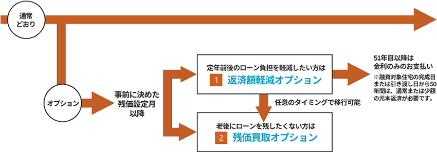 残価設定月以降に月々の支払い負担を大幅に軽減できるオプションです。通常は一定額のローンを返済し続ける必要がありますが、このオプションを選択した場合、一定の残高まで返済が完了(残価設定月)すると、以後の返済が少額の元本と金利のみとなります。さらに50年後からは元金の金利のみの支払いとなる新型リバースモーゲージへ移行します。