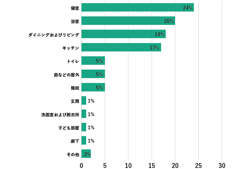最も多かったのは「寝室」(24%)でした。就寝中はとっさに身を守る行動が取りにくく、夜間の地震被災への不安が大きいことがうかがえます。続いて、無防備な姿のためすぐに避難できない恐れもある「浴室」(20%)、家族が集う場所で大型家具・テレビの転倒やガラス破損のリスクもある「ダイニングおよびリビング」(18%)、火の元や食器棚の転倒など危険要素が多い「キッチン」(17%)が上位に入りました。