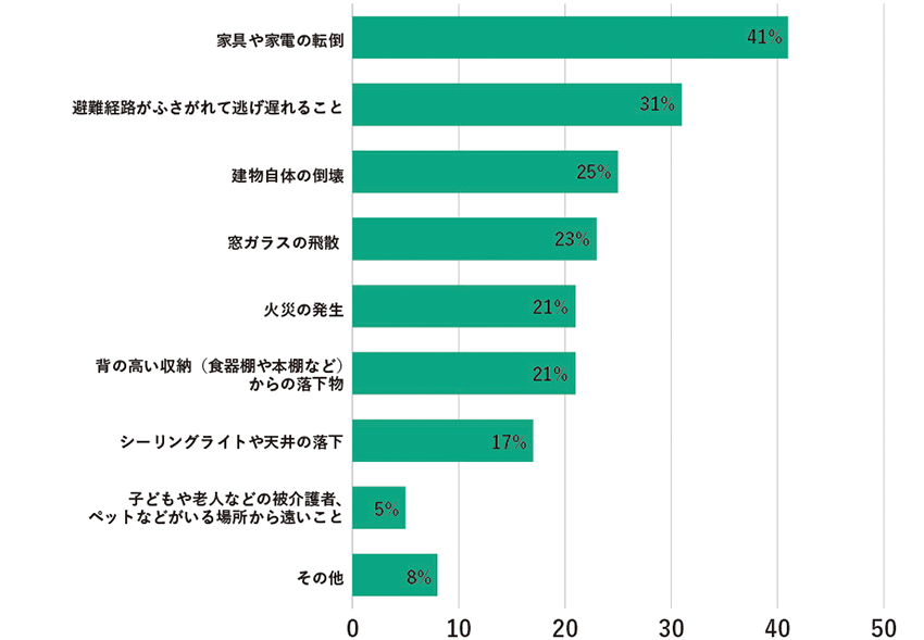 次いで「避難経路がふさがれて逃げ遅れること」(31%)、「建物自体の倒壊」(25%)が上位にあがり、地震による直接的な被害と避難のしやすさへの懸念が大きく影響しているようです。