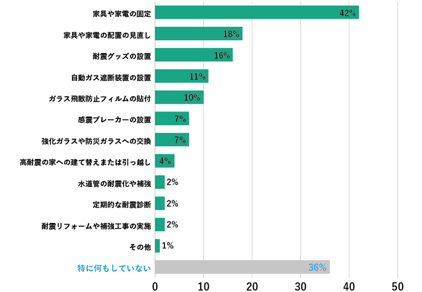 最も多かったのは「家具や家電の固定」(42%)でした。耐震ジェルマットや突っ張り棒など取り入れやすい方法も多く、揺れによる直接的な被害を減らそうとする意識がうかがえます。次に多かったのが「特に何もしていない」(36%)で地震対策に未着手の方も少なくありませんでした。