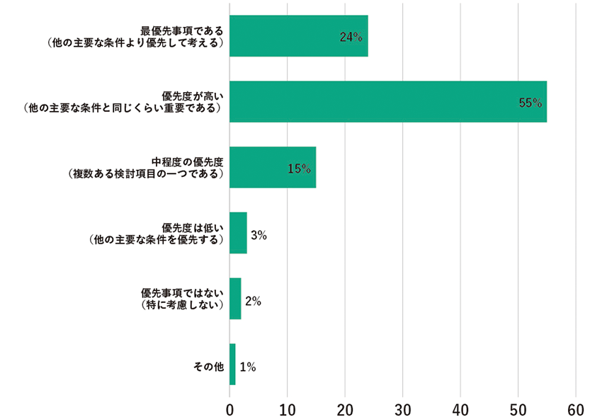 「最優先事項」と答えた24%の方は耐震性能を住まい選びの第一基準としています。「優先度が高い」と答えた55%の方は、価格や立地も考慮しつつ、耐震性能は欠かせない条件と捉えていました。