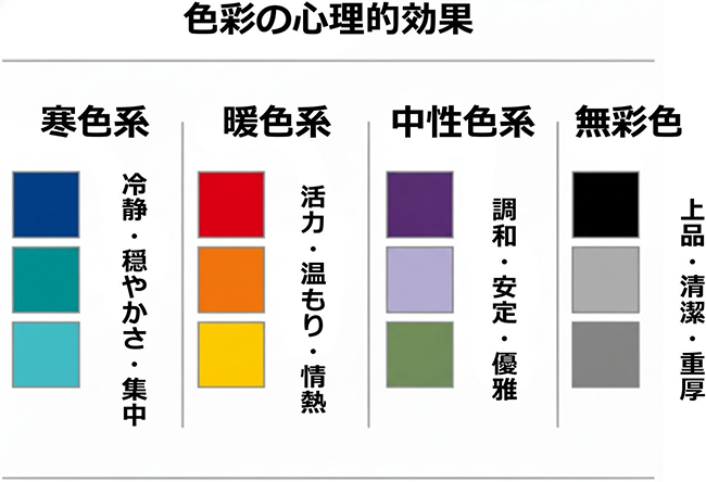 例えば、「ブルーなど寒色系」=冷静・穏やかさ・集中、「レッドなど暖色系」=活力・温もり・情熱、「パープルなど中性色系」=調和・安定・優雅、「ホワイトやブラックなど無彩色」=上品・清潔・重厚、といったように色によって心理的に与える印象が異なります。