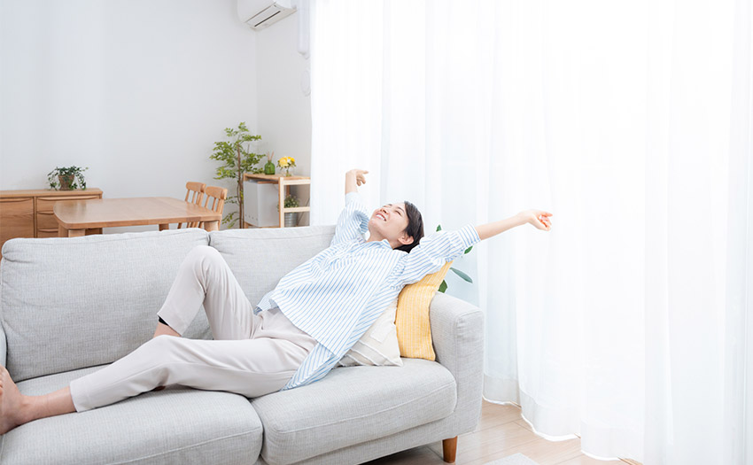 お伝えした通り、リラックスして落ち着いて過ごせる部屋にするには、快適な室温を保つ必要があります。しかし、外気温の影響を受けやすい住まいで冷暖房を効かせようとすると光熱費が高くなりがちです。家づくりの際は、気密性・断熱性が高い建物を選び、光熱費の無駄な出費を減らせるようにすると良いでしょう。気密性・断熱性が高いと、エアコンのある部屋と、そうでない廊下などとの温度差も少なくなり、暑さ・寒さによる体へのストレスも軽減できます。