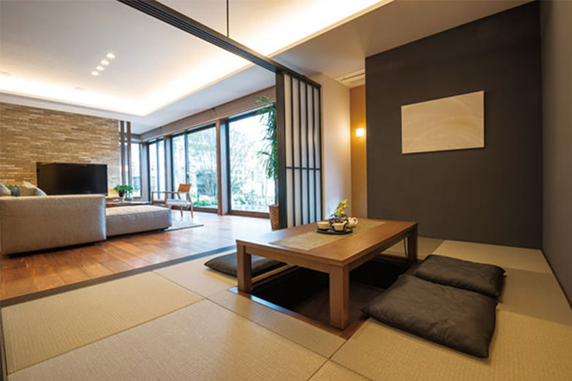 あぐらをかいて座ったり、気軽に横になったりして、自由にくつろげるのが畳敷きのスペースの魅力です。畳の若草色は目にもやさしく落ち着いた気持ちにしてくれるほか、畳の上に直に座ることが多いため、視線が下がり、天井が高く開放的に感じられます。小さな子どもがいる家族なら、お昼寝をさせたり、一緒に遊んだりするスペースとしても活躍します。