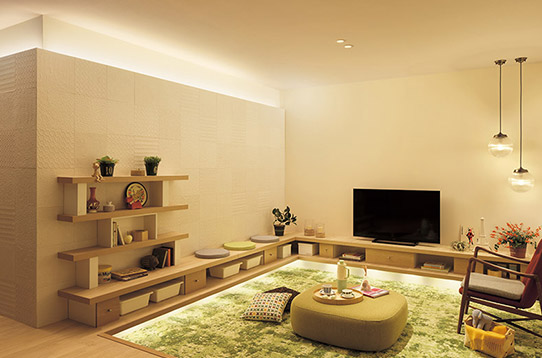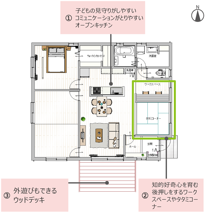 ワークスペースは、幼児期は絵本を読んだり、学童期は宿題など勉強をしたり、多目的に使えます。分からないことは近くにいるパパとママにすぐ聞けるのがポイントです。タタミコーナーは、お昼寝や、子どもの遊び場、洗濯物をたたむ時にも使えて便利です。