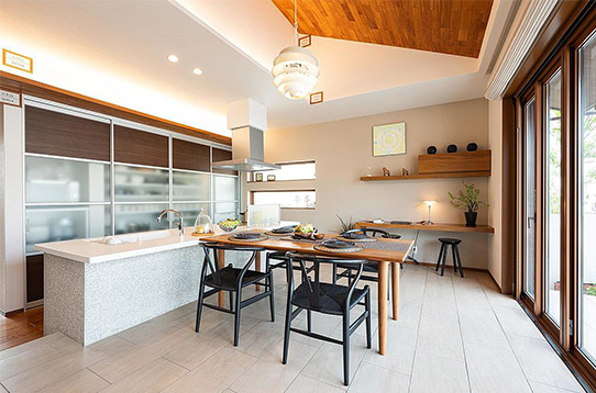 食事の準備や片付けをしながら、ワークスペースやタタミコーナー、リビングにいる子どもの様子を見守れるオープンキッチンなら、親子のコミュニケーションもスムーズです。洗濯スペースと収納スペースの中間にキッチンがあることで、快適な家事動線も実現しています。