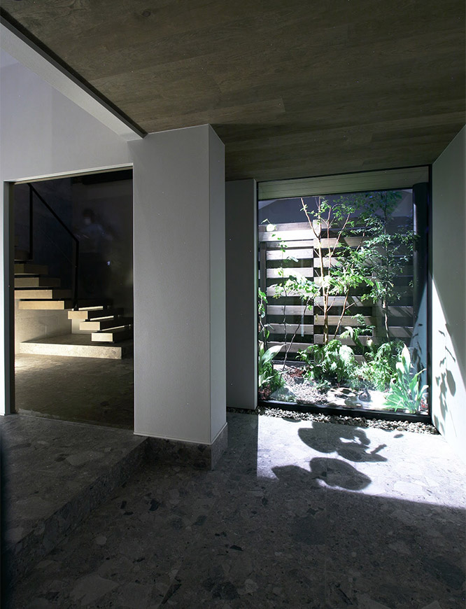 私たちは住宅密集地のコンパクトな土地に家を建てるとき、まず「どこから光を取り込むか」を最初に設計します。必ずしも南側を採光部にすればいいというわけではありません。隣家の高さのない場所や、隣家の庭に面している方向など、抜けのあるところを見つけて、そちらを光の取り入れ口にします。