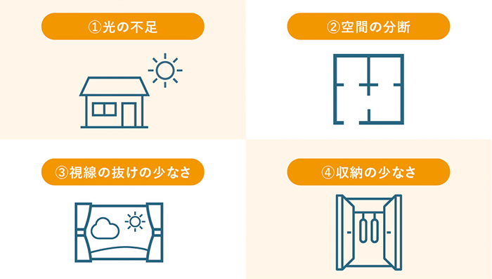 4つ目は「収納の少なさ」です。限られた間取りの中で収納スペースを十分設けられず、「引っ越すときにモノを減らそう」と考えていたのに、結局ほとんどを持ち込んでしまうというケース。収納に収まりきらないモノが部屋にあふれて、窮屈な印象を生むということも少なくありません。