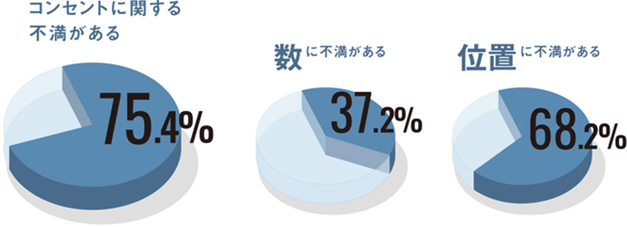 パナソニックとルームクリップ株式会社が実施した「コンセントに関するアンケート」では、施主の75.4%が「コンセントに関する不満がある」と回答しています。ちなみに、「位置に不満がある」が68.2%、「数に不満がある」が37.2%で、不満の多くが数よりも位置に関するものでした。