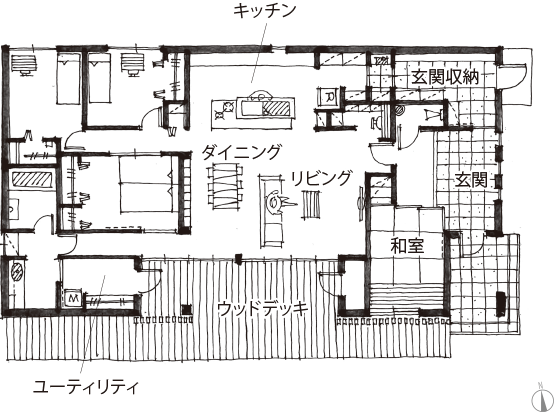 - 深い軒とウッドデッキを設け、リビングと屋外が一体化する縁側のような半屋外空間