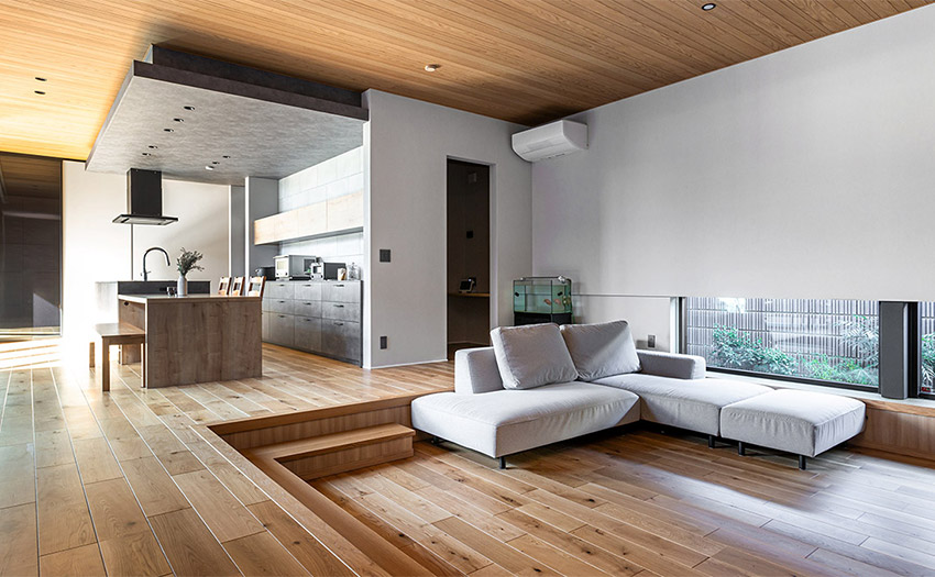 ロースタイルリビングは、地窓から外の地面に近い景色を眺められる設計で、低く落ち着いた居心地の良い空間に仕上げられています。玄関は木目扉の収納をシームレスに組み込み、奥には手洗いスペースを配置。さらに、中庭には深い軒を設けて雨や日射を防ぎ、家族の気配が中庭を通して感じられる構成となっています。