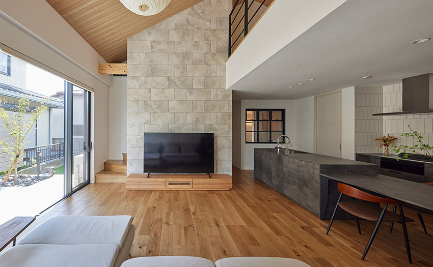 - 勾配天井とロフトを組み合わせ、平屋ベースでも縦方向の広がりを確保している