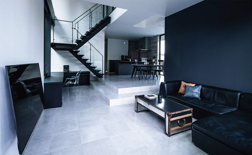 延床面積約40坪の2階建て住宅。サッシを連続させた壁一面の大開口とダイナミックな吹き抜けを組み合わせ、LDKに強い開放感をもたらした住まいです。リビングでは鉄骨の構造梁とブレースを現しにして黒く塗装し、吹き抜け空間のアクセントとして生かしています。アイアンの階段手すりとも調和し、モノトーンでまとめたインテリアを引き締める構成です。ダイニングキッチンは黒のキッチンや背面収納、黒タイルのアクセント壁で統一し、白い大理石柄タイルとのコントラストによって洗練された印象に仕上げています。