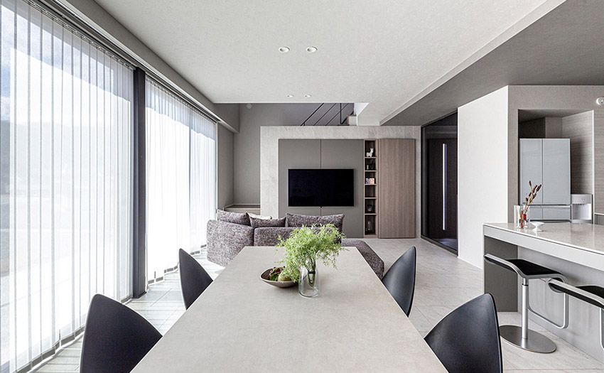 無駄を省いたミニマルな空間構成と、窓からの景色や光を楽しむ設計が特徴の住まいです。西側に広がる山の景色を取り込む大きなFIX窓が1階と2階をつなぎ、住まいの中心に配置されたスケルトン階段と吹き抜けが空間に広がりと連続性を生み出しています。サッシを天井まで伸ばし、壁との段差をなくすことで、床と壁が一体となるように設計されており、余計な要素を抑えたシンプルな空間がつくられています。ダイニングテーブルやチェア、階段のビスまでモノトーンで統一し、ギャラリーのような凛とした雰囲気に仕上げられています。