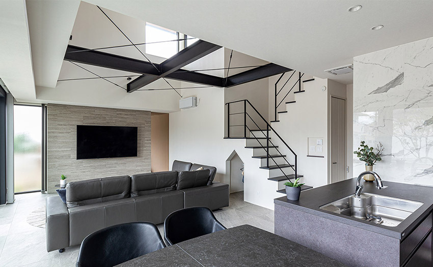 鉄骨梁が映える吹き抜けリビングと大開口で開放感を高めた住まい