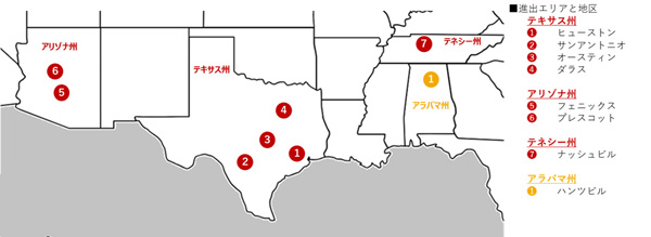 大和ハウスグループでは、地域の気候や文化などに配慮した地域密着型の事業を展開することで、米国での進出地域の拡大を進めています。戸建住宅事業では、現地法人である大和ハウスグループ3社(スタンレー・マーチン社、キャッスルロック社、トゥルーマーク社)が、米国の東部、南部、西部を結ぶスマイルゾーンを中心に事業を進めており、各地域での戸建住宅会社のM&Aなどで営業・施工体制を整備しながらエリアの拡大を図っています。 米国南部地域で戸建住宅事業を展開するキャッスルロック社は、大和ハウスグループとなった2021年9月にはテキサス州を中心に事業展開していましたが、2023年7月にはアリゾナ州フェニックスに拠点を新設。2024年1月には、The Jones Company of Tennessee, LLC (ジョーンズ社)の戸建住宅事業を取得し、テネシー州に進出してきました。 そしてこのたび、キャッスルロック社は、さらなる事業拡大を目指し、アラバマ州ハンツビルを中心に事業を展開するレン社の戸建住宅事業を譲受することとしました。