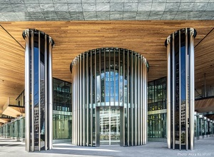 |  | メインエントランス 交差点の景観を印象づける特徴的なエントランスです。鏡面仕上のマリオンとガラスで構成されたシリンダーは、土佐堀川の水面の様に煌めきながら、昼間は街の風景を映し出し、夜間は内部の賑わいを街に発信します。