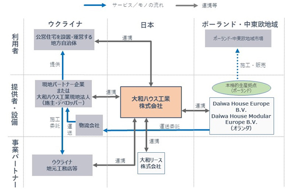 ◆「ウクライナ公営住宅向けプレハブ住宅の生産・建築・提供FS実証」の事業概要 【目的】 •ウクライナの政府・地方自治体が国内外避難民のために、緊急に必要とする質の高い公営住宅として、当社のプレハブ技術を活用した集合住宅を納入・供給し、住宅分野の復興に貢献。 •国土交通省が設立した官民協議会をはじめ、日本政府主導のウクライナ復興支援に貢献。 •当社プレハブ住宅の品質や価格に対するウクライナでの評価データを中東欧市場における競争力の指標として把握し、今後の本格展開で活用。 •ポーランドでの仮設生産施設における企画・設計・生産、ウクライナへの輸送、現地での組み立て、建築などの一連の業務がFS時の想定通り円滑に進むかを検証。抽出された課題を今後の中東欧市場への本格展開に活用する。