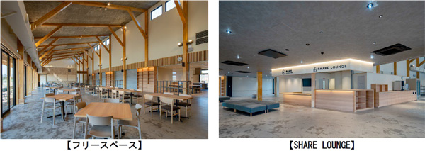 ■交流拠点を木造建築で実現 大和ハウス工業は2050年のカーボンニュートラル実現に向けて「木造・木質建築事業」を掲げ、非住宅の木造・木質化を推進するプロジェクト「Future with Wood」を加速させています。その中で、本施設もCO2の固定化や森林資源循環などに貢献するため、木造建築とすることで木材利用の推進にも寄与しました。また、木材には落ち着きを与える効果が期待できるため、利用者に心地よい場となるよう、フリースペースや、CCCが運営する「SHARE LOUNGE」にも木材を採用しています。