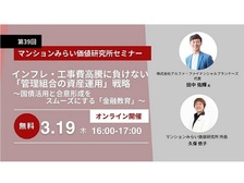 大和ハウスグループの大和ライフネクスト株式会社(本社:東京都港区、代表取締役社長:齋藤 栄司)の分譲マンション総合研究所「マンションみらい価値研究所」は、マンションのみらいを考える無料WEBセミナー『インフレ・工事費高騰に負けない「管理組合の資産運用」戦略 ~国債活用と合意形成をスムーズにする「金融教育」~』を、2026年3月19日(木)に配信いたします。 【セミナーお申し込みはこちら】 https://www.miraikachiken.com/seminar/260217_0319seminar01/