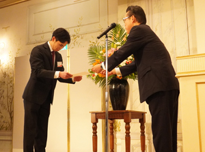 「内定セレモニー」では人事担当の常務執行役員 能村より、内定者代表に内定通知書が授与されました。その後、内定者全員に向けて、「自信と誇りを持ち、前向きな気持ちで入社までの期間を過ごしてください。来年4月に皆さんとお会いできるのを楽しみにしています。」と、お祝いのメッセージが贈られました。