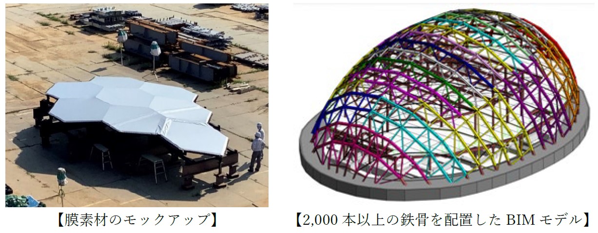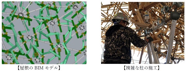 また複雑なタマゴ型の造形を表現するため、建造物の骨組みに2,000本以上の鉄骨を用いましたが、建造物の軸を垂直ではなく15度斜めに配置した設計のため、骨組みをすべて組み立てるまで建造物が自立できませんでした。そこで、BIM(※3)を活用して傾いた柱やそれを支えるワイヤーの位置を細かく調整し、安全を確保しながら施工を進めました。