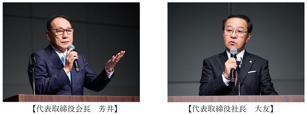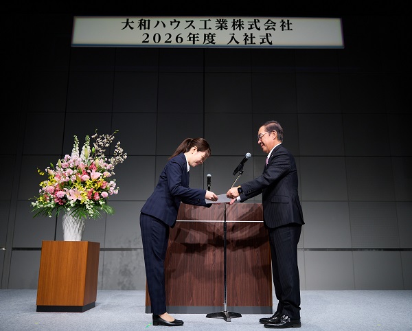 歓迎の挨拶で、代表取締役会長の芳井は「働く上での『夢』を決めて、それを追いかけることが大事。これから社会に向けてしっかりと羽ばたいてほしい」と述べ、新入社員への期待を伝えました。また、代表取締役社長の大友は「創業70年を超えた今も、大和ハウスはベンチャー企業。チャレンジ精神を忘れず、新しいことに常に取り組んでほしい」と、激励しました。