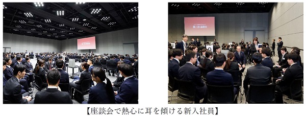 入社式では、辞令授与や歓迎の挨拶のほか、先輩社員からのメッセージ、新入社員と役員が直接対話する座談会などを実施しました。
