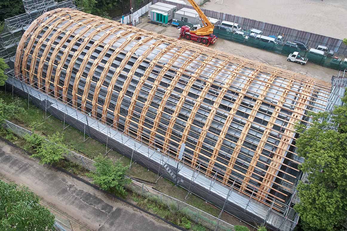 木造で無柱の大空間を構成する技術として、シザーストラス構造を採用しました。一般的な製材をボルト接合して施工でき、高度な技術を必要としない汎用性の高い構法です。