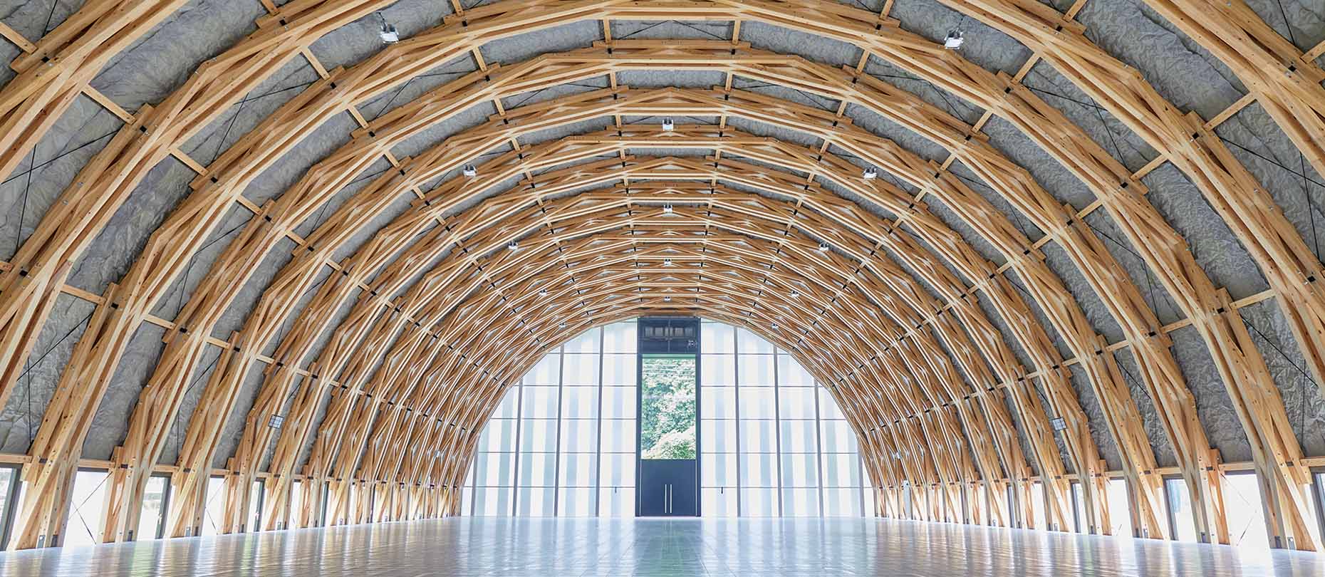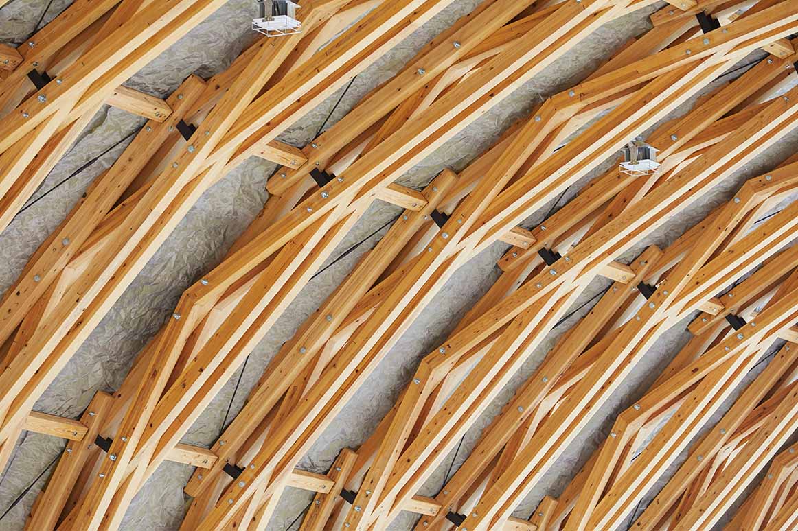 木材を規則的に組み合わせたシザーストラス構造が、無柱の大空間を支えます。
