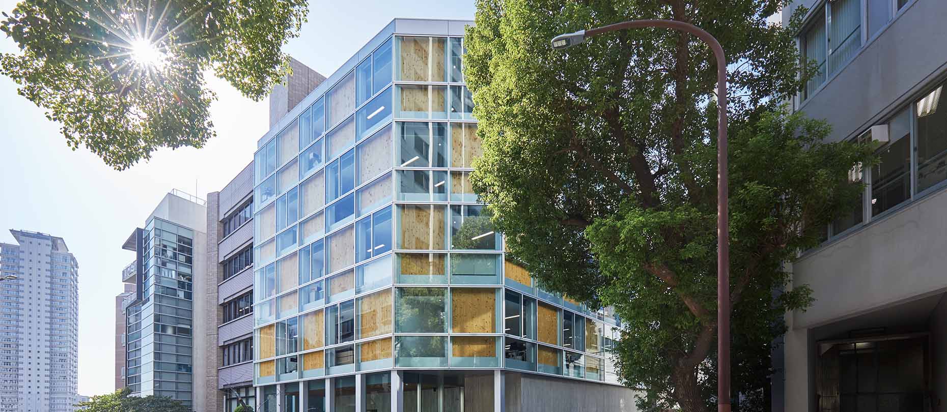 CLT+鉄骨の混構造により、防火地域における大規模な木造建築を実現しました。外観は、CLTを意匠として見せるデザインとガラスのカーテンウォールを組み合わせ、木質感あふれる表情に。室内もCLTの木肌を見せ、快適な空間を創出しています。
