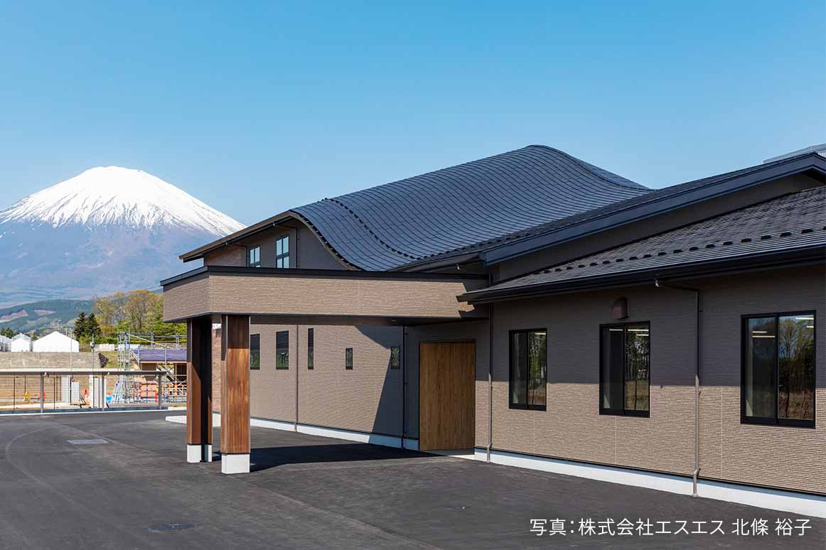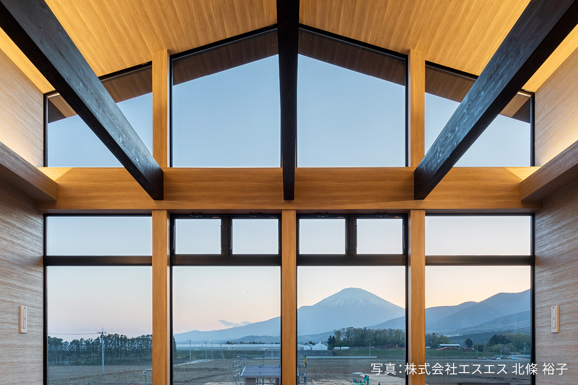 富士山を一望できる立地を活かし、雄大な山景を取り込む大開口を確保。屋根は、山々の稜線と調和するよう、曲線の形状を設計しました。室内はあたたかみのある快適なデザインを追求し、木肌を活かしたエントランスや小屋組を見せる2階サロンなど、木の質感に包まれる空間を創出。床や壁、天井などの内装材には地元・静岡県産材を採用しています。