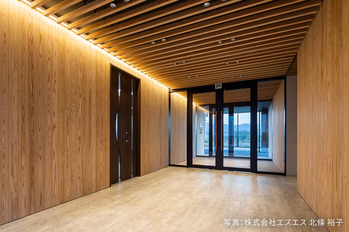 訪れる人を木のぬくもりで包み込むエントランスホール。天井・壁・床には地元産の木材を使用し、地域木材の利用拡大に貢献。 -